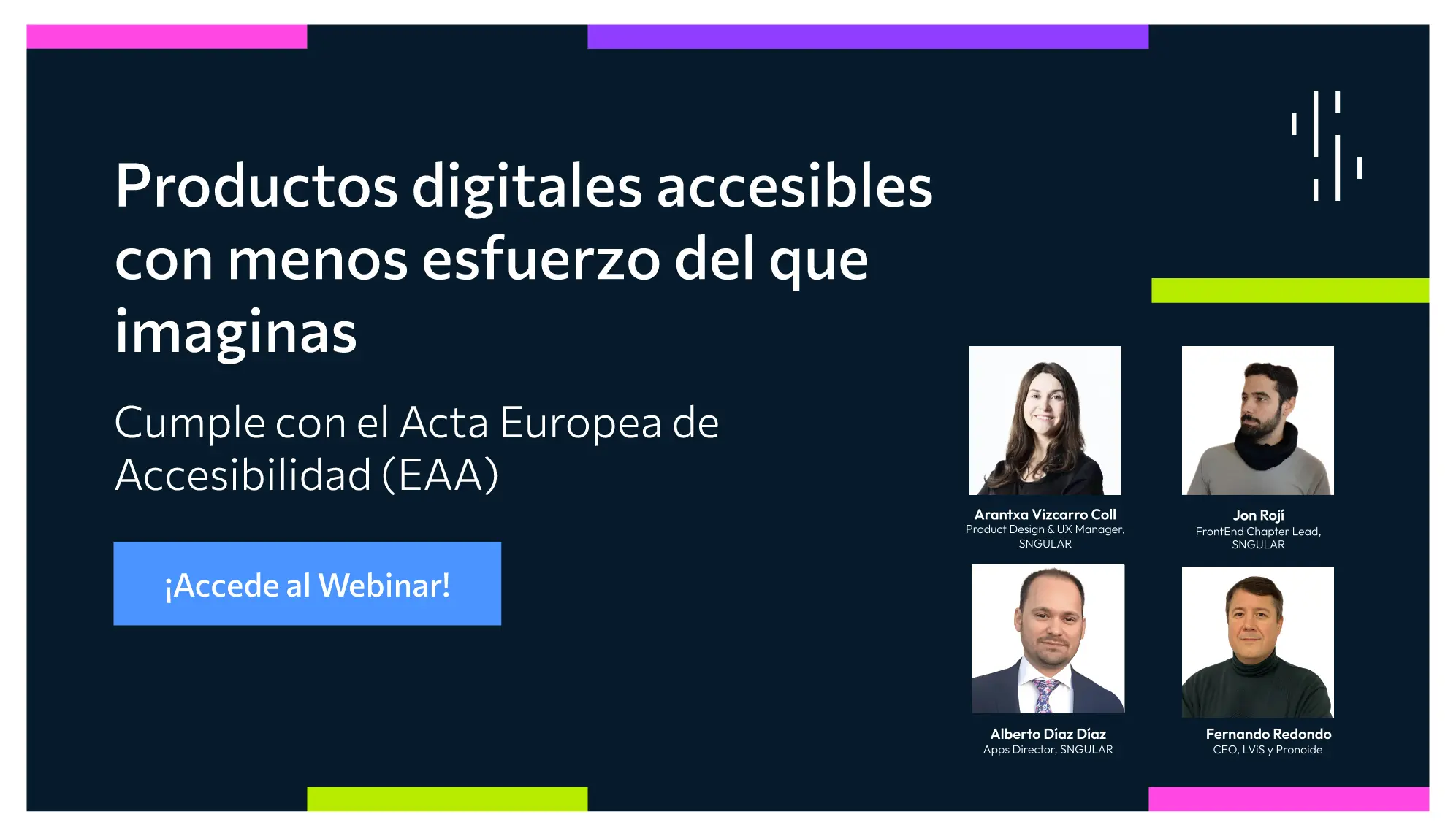 La Oficina de Accesibilidad es un equipo especializado, comprometido con garantizar que las aplicaciones web y móviles cumplan con las normativas y estándares de accesibilidad. Desde la oficina de accesibilidad de SNGULAR trabajamos junto a nuestros clientes para identificar y eliminar las barreras que dificultan la inclusión digital.